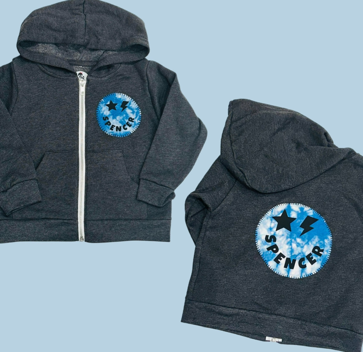This tie dye emoji is the perfect combo of edgy and cute. It is a zip up hoodie that comes gray or black. The emojis are hand stitched on