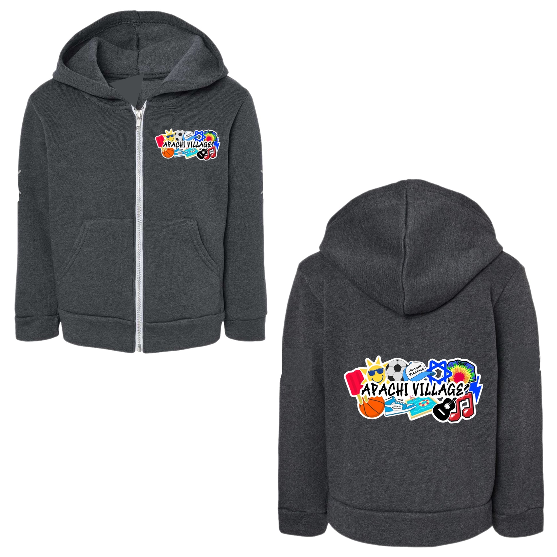 Show your APACHI Village pride with this awesome APACHI Village boys collage zip hoodie. This is soft, fleece lined zip hoodie. This hoodie comes in black, blue, or gray