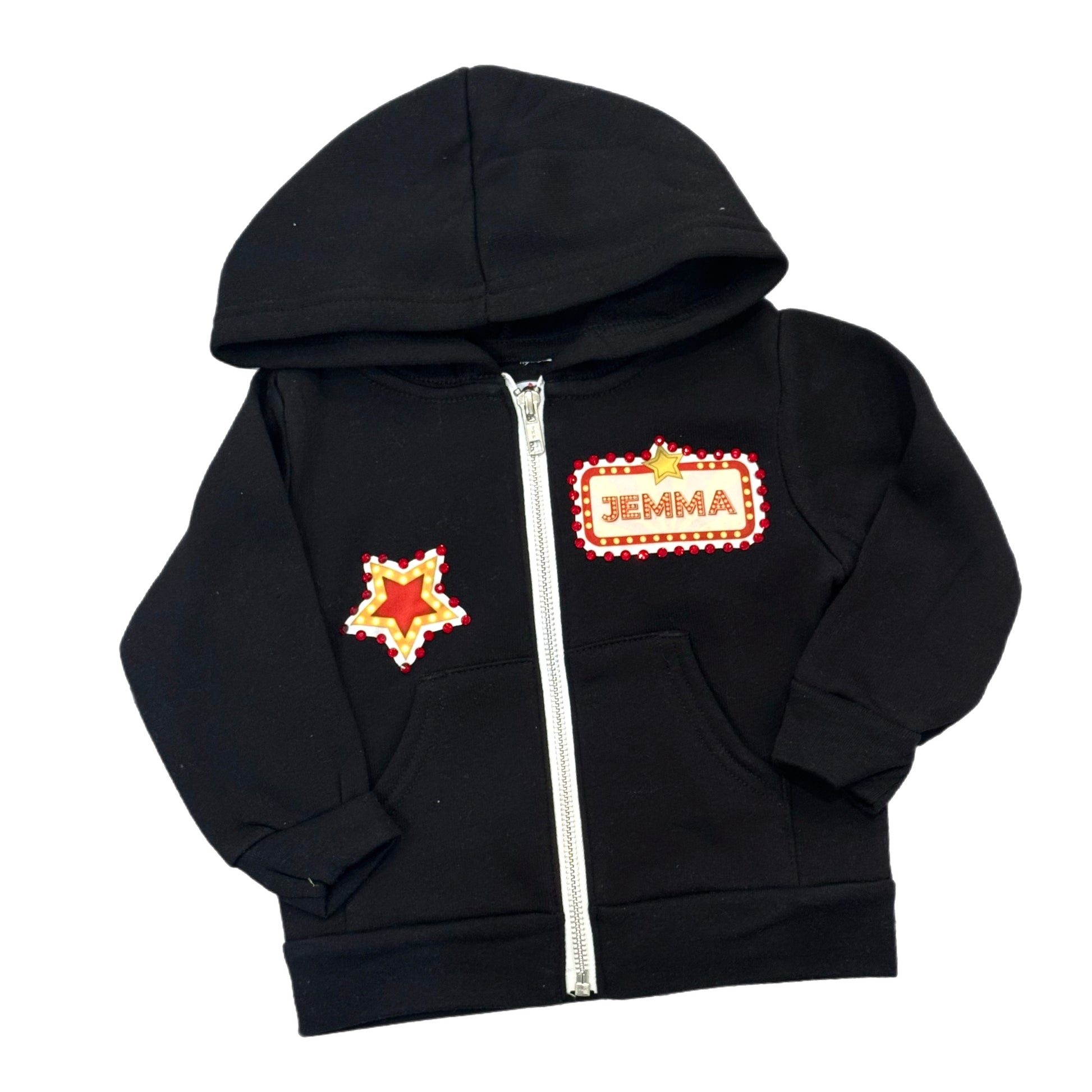 This favorite musicals zip hoodie is the cutest! It is a zip up hoodie that comes gray or black. The hoodie is finished with a touch of bling.