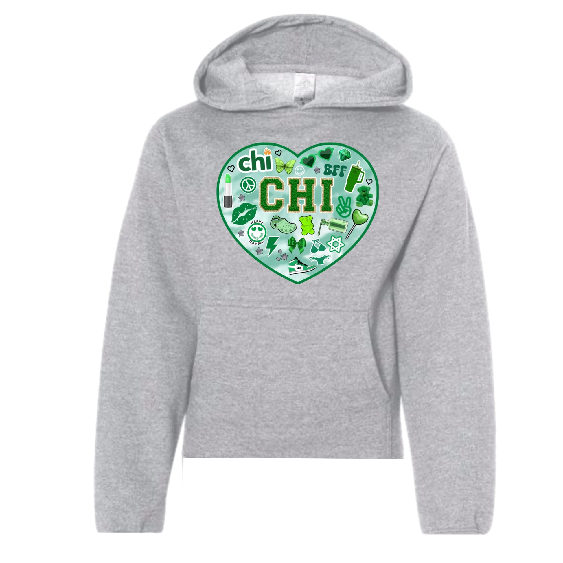 Show your Camp Chi spirit with this adorable Camp Chi heart hoodie. It’s a soft fleece lined hoodie. This can be made in gray or black. The bottom is a slightly shorter raw hem.