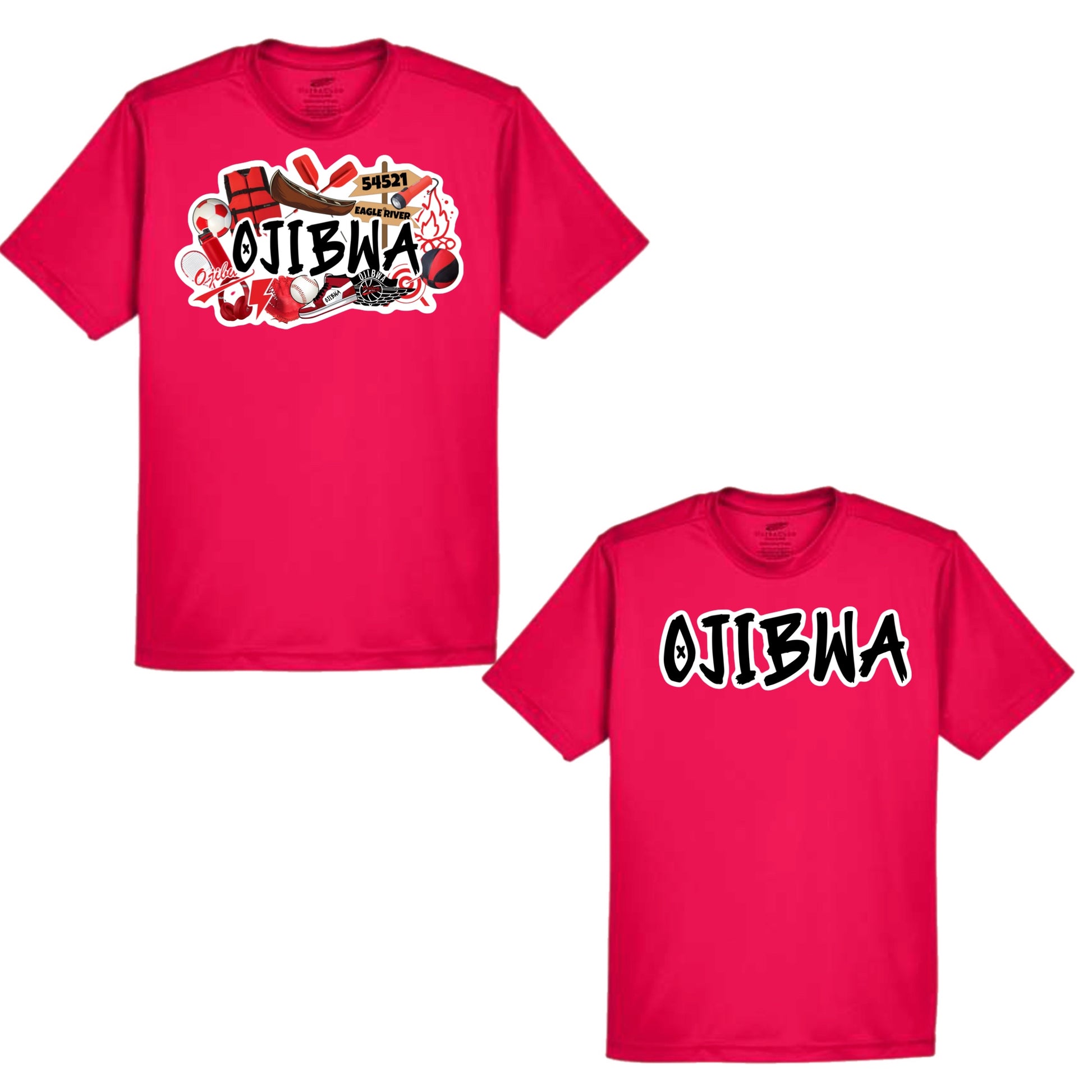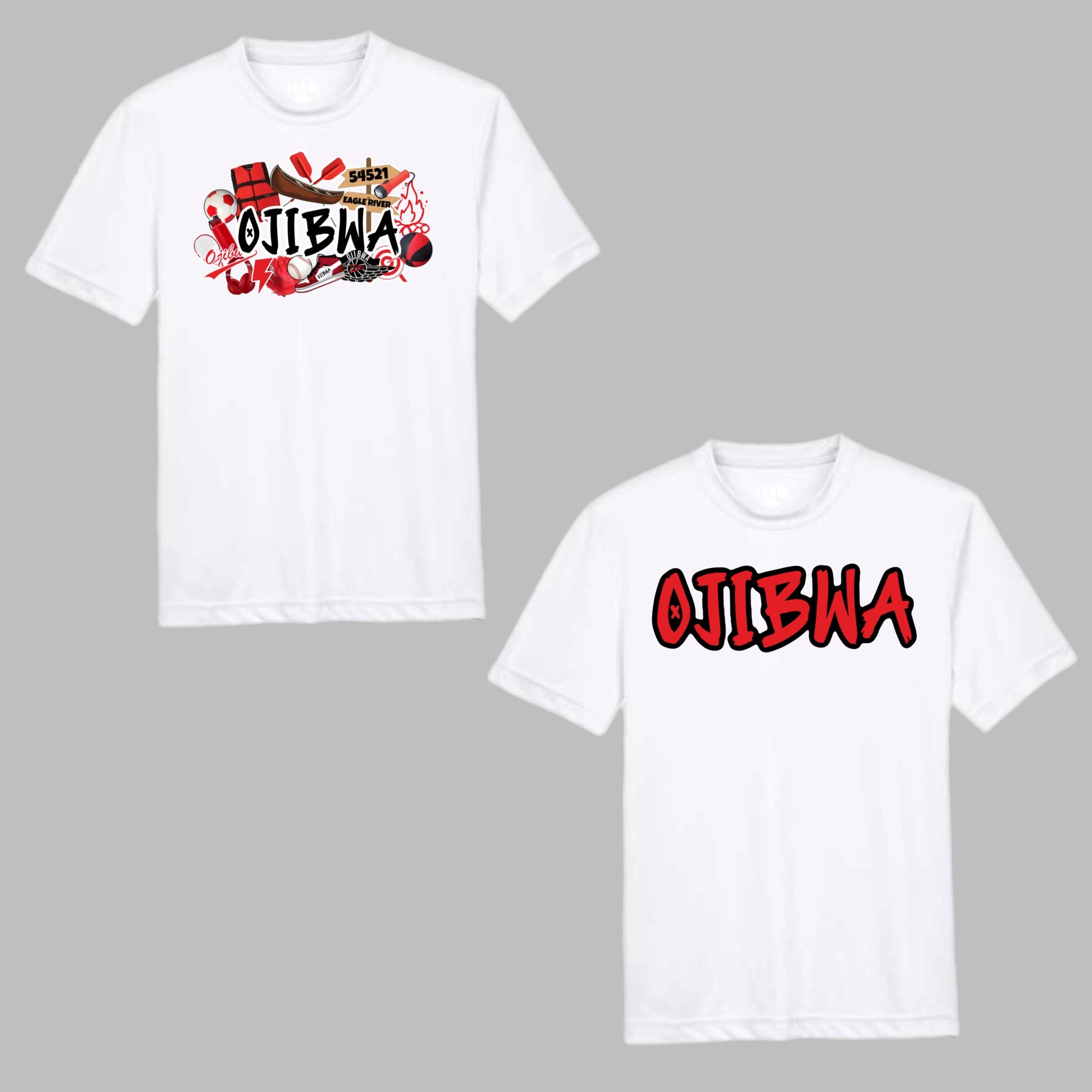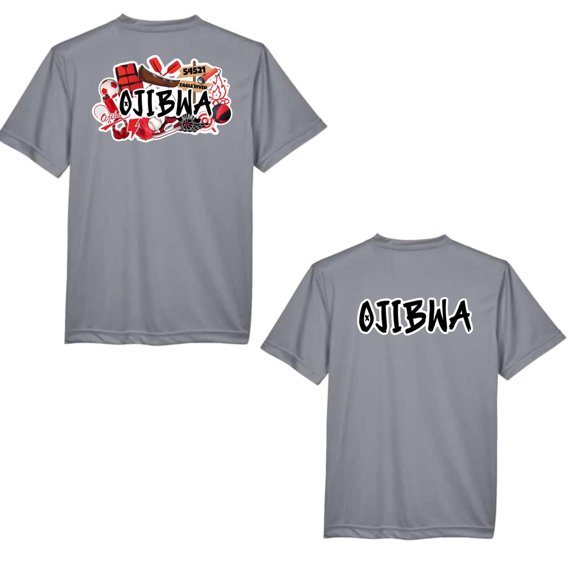 Show your Ojibwa spirit with this awesome Ojibwa graffiti performance, moisture wicking tee. This tee is available with the collage image (pictured on left) or the camp name (pictured on right)